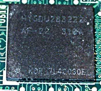 | На карте установлены микросхемы DDR памяти Hynix марки HY5DU283222-AF22, форм-фактора BGA. Максимальная частота работы — 450 (900) МГц, время выборки — 2.2 нс. По умолчанию память работает на частоте 425 (850) МГц, чип — 450 МГц. | ![]() |