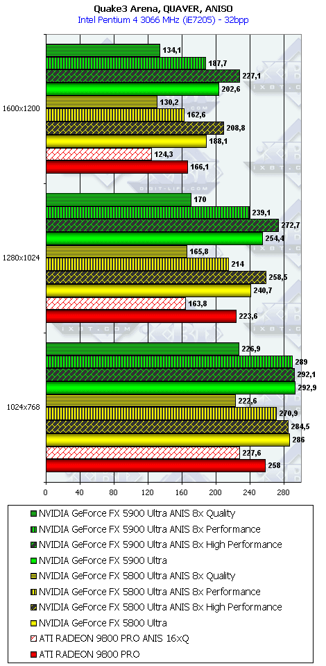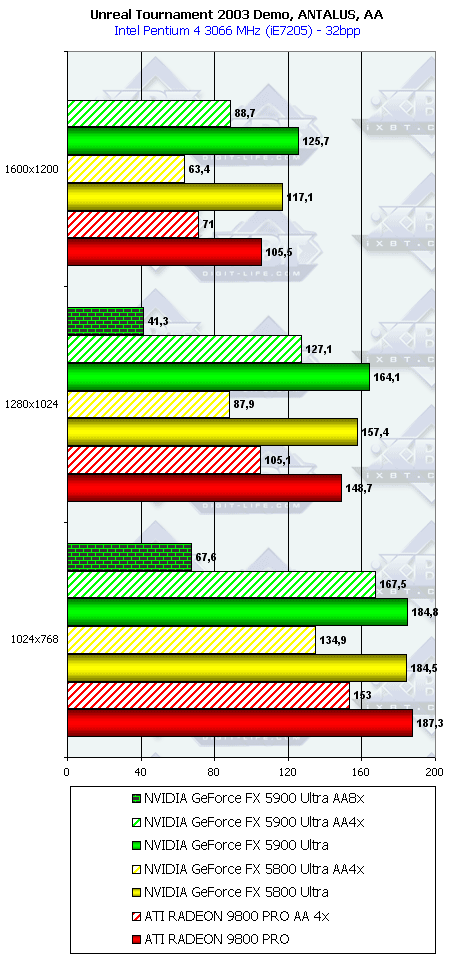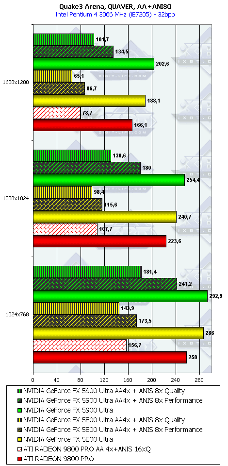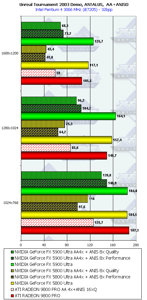 Сразу отмечу, почему мы использовали в наших тестах настройки анизотропии 16х у карт от ATI и 8х у карт от NVIDIA. Никакой дискриминации в отношении карт от ATI нет! Алгоритмы работы этой функции у ATI и NVIDIA очень различаются (об этом мы говорили подробно в нашем материале по NV30), поэтому сопоставлять только цифры "8" неразумно. Критерий один: максимально возможное качество. У NVIDIA по ее "счетчику" — это 8х, а у ATI — 16х. Скриншоты мы уже приводили, и не один раз. К тому же, интересно будет узнать, как сопоставляются разные режимы работы анизотропии от NVIDIA с максимально качественным режимом от ATI, тем более, что опять же, скриншоты мы уже приводили, и читатель может оценить соотношение скорости и качества (милости просим в обзор NV30 за скриншотами оценки качества анизотропной фильтрации).