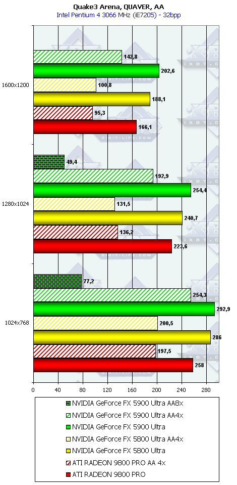 - Как и ожидалось, наличие 256-битной шины обмена с памятью сильно помогло NV35 в режимах с АА. Не забываем, что ПСП увеличилась в