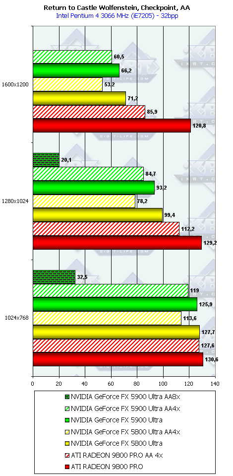 - Return to Castle Wolfenstein (MultiPlayer) (id Software/Activision) — OpenGL, мультитекстурирование, Checkpoint-demo, настройки тестирования — все на максимально возможном уровне, S3TC OFF, конфигурации можно скачать тут