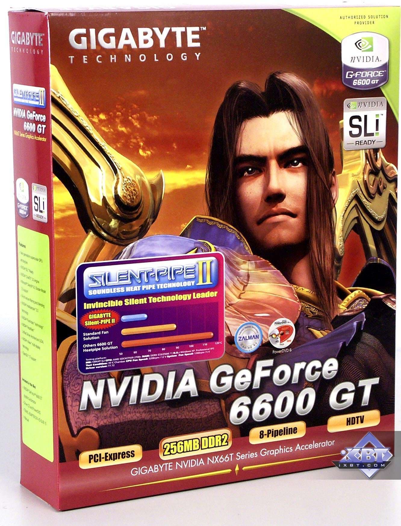 - Gigabyte GeForce 6600GT Silent PCI-E 256MB DDR2 — очень интересный продукт. Да, снижение частоты работы памяти, конечно, отъело от производительности от 5 до 10%, однако, все равно карта очень привлекательна. Во-первых, стоимость ее будет ниже, чем у обычного 6600GT, во-вторых, бесшумная работа гарантирована, причем, очень даже устойчивая, поскольку температура нагрева ядра не превысила 70 градусов при работе на штатных частотах, и не выше 75 градусов при разгоне.