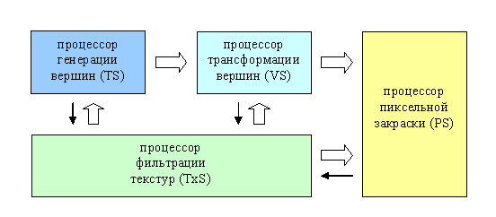 Обратите внимание на зеленый блок — это процессор фильтрации, выборки и обработки текстур. На данный момент все нестандартные операции с текстурами, такие как специальные методы фильтрации или генерация процедурных текстур исполняются на уровне пиксельных шейдеров, а некоторые задачи, такие как распаковка сжатых форматов текстур реализованы только жестко аппаратно. Однако, гораздо эффективнее выделить для этого отдельный процессор и в будущем это будет сделано. Текстурные шейдеры (TxS) уже известные по программным пакетам реалистичной графики, будут отвечать за генерацию по запросу процедурных текстур, выборку, преобразование и модификацию значений обычных текстур, реализацию оптимальных методов сжатия и, самое главное, на специальные методы фильтрации, например продвинутую анизотропную, стохастическую или, очень важную для будущих приложений фильтрацию с учетом движения объекта для реализации эффективного и качественного сглаживания движущихся объектов.