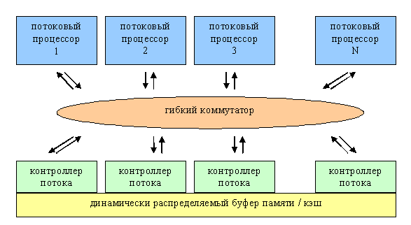 а между процессорами (кружки) организуются одно и двунаправленные асинхронные очереди данных, которыми фактически заведуют контроллеры потока (см. предыдущую схему). Каждый контроллер настраивается для того или иного метода хранения данных (стек, очередь, просто произвольный доступ) и получает в монопольное владение часть скоростной внутренней памяти (кэша) ускорителя или реализует доступ к потоку данных из внешней по отношению к чипу ускорителя локальной или системной памяти. Возможен и режим с произвольным, не потоковым доступом, но в реальных приложениях следует всячески избегать подобных настроек, ибо они способны существенно подорвать производительность в результате плохо оптимизируемых попыток доступа к внешней памяти. Однако, так или иначе, за счет интенсивного кэширования и использования предсказания паттернов доступа данная задача может быть решена на твердую «4», пусть и не в первом поколении таких ускорителей, открыв путь к более привычным программистам подходам, например, к произвольной индексации элементов массивов.