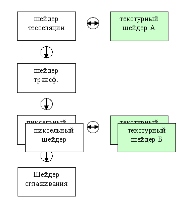 Между процессорами расположены очереди данных, отмеченные на рисунке стрелками. Они позволяют накапливать (а по возможности и кэшировать для повторного использования) рассчитанные одним процессором для другого данные, и таким образом избежать задержек, позволив процессорам работать параллельно и в должной степени асинхронно. Именно наличие таких четких однонаправленных потоков данных позволяет эффективно распараллеливать задачи по построению изображения и одновременно именно этот факт накладывает на шейдеры существенные ограничения - например, они не могут иметь произвольный доступ к данным соседних примитивов или пикселей, т.к. они могут рассчитываться параллельно или еще не быть рассчитанными. Впрочем, обладая возможностью, так или иначе, записать поток данных с выхода шейдерного процессора и снова подав его на вход, мы можем (так сказать «в несколько проходов») реализовать более сложные алгоритмы, включая произвольный доступ, пускай и не самым удобоваримым путем.
