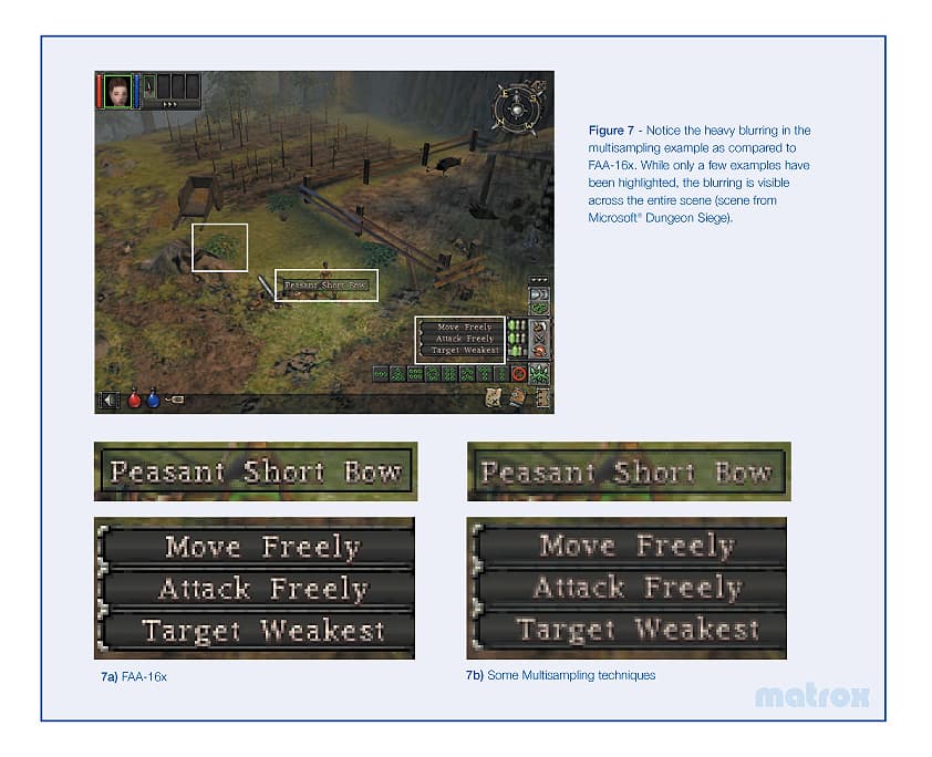 Однако, столь интеллектуальный метод AA способен вызывать артефакты в некоторых случаях. Кроме того, он не может корректно обрабатывать сглаживание границ перемешаных с полупрозрачными полигонами (например облака, туман, стекла, огонь в играх). Пользователь может переключится на хорошо знакомый классический 4х (2х2) MSAA также поддерживаемый чипом.