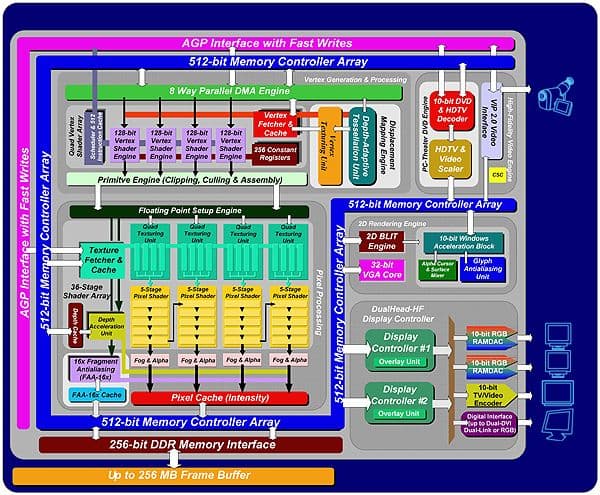 Итак, по сравнению с предыдущим поколением ускорителей, вдвое увеличится пропускная полоса локальной видеопамяти. Но скорость не главный конек продуктов от Matrox. На удивление, чип Parhelia-512 не оснащен какими-либо технологиями экономии пропускной полосы памяти. Этот факт удивителен подобные технологии присутствуют во всех последних продуктах от ATI и NVIDIA, но видимо Matrox решила ускорить и удешевить разработку чипа, являющегося для них скорее символом, чем попыткой завоевать рынок.