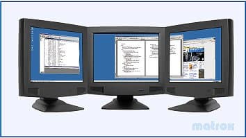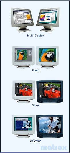 - Возможность вывода одного изображения, растянутого на два или даже три (!) приемника. Например, на 2 встроенных и один внешний RAMDAC или на оба встроенных RAMDAC и TV-Out. Суммарное разрешение в тройном режиме до 3840x1024x32bpp. Технологии TripleHead Desktop, Surround Gaming и DualHead-HighFidelity (HF)