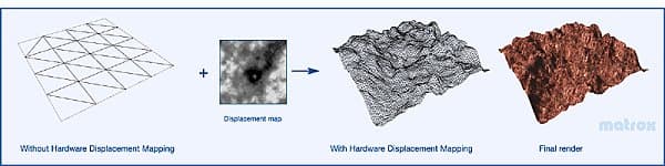 Лицензированная у Matrox Graphics Inc. (и, разумеется, реализованная в Parhelia-512) технология Displacement Mapping позволяет существенно увеличить степень реалистичности и детальности рельефных поверхностей. В отличие от привычных уже разновидностей рельефа, наносимого на поверхности треугольников при закраске и не влияющего на видимость тех или иных точек (картой рельефа моделируется только освещенность точки, а не ее реальное положение в пространстве) карты смещения позволяют создавать геометрически корректные рельефы, пересечение которых в пространстве не будет выглядеть идеальной прямой. Фактически эта технология модифицирует положение вершин треугольников, сдвигая их в направлении нормали к поверхности на величину, пропорциональную значению из специальной текстуры (карта смещения):