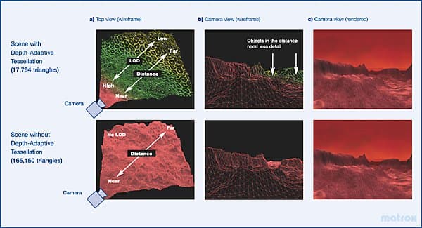 Интересно, что в DX9 патчи претерпели существенные улучшения, например степень детализации (число разбиений) теперь может выбираться автоматически в зависимости от расстояния от треугольника до наблюдателя. Таким образом, достигается более оптимальное, близкое к равномерному (с точки зрения наблюдателя) разбиение сцены все треугольники имеют примерно одинаковый видимый размер: