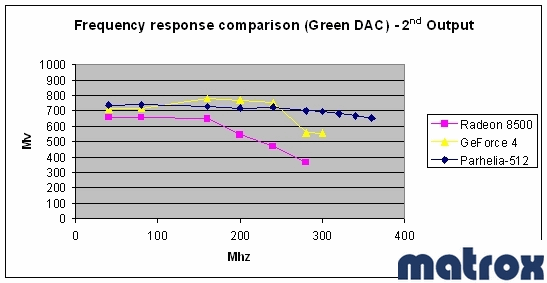 К слову о качестве RAMDAC. Matrox всегда славилась качественным 2D компания даже приводит результаты испытаний (!) частотной характеристики своих RAMDAC в сравнении с основными конкурентами. Первичный: