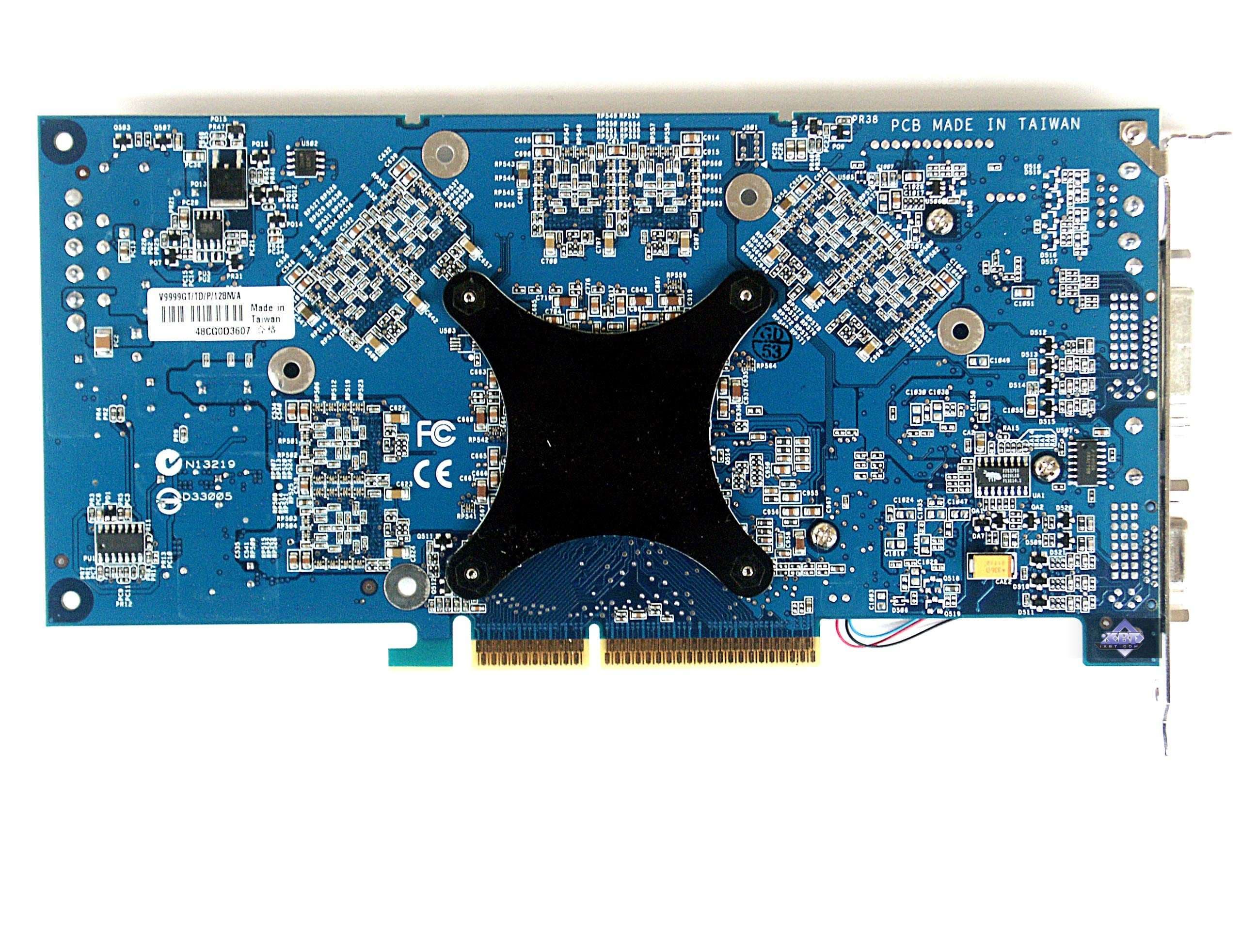 Очевидно, что плата почти полностью копирует эталонный дизайн для GeForce 6800. Система охлаждения очень узкая, поэтому карта второй слот после AGP не занимает.
