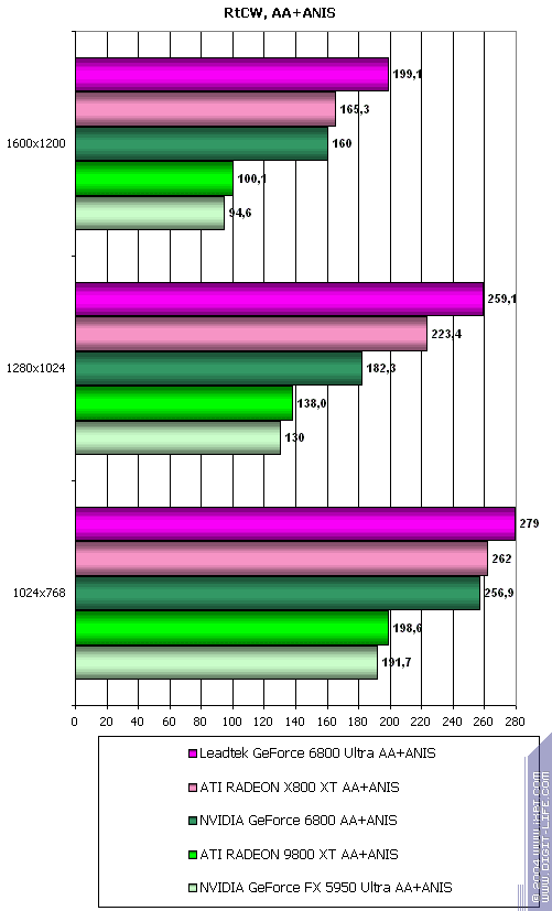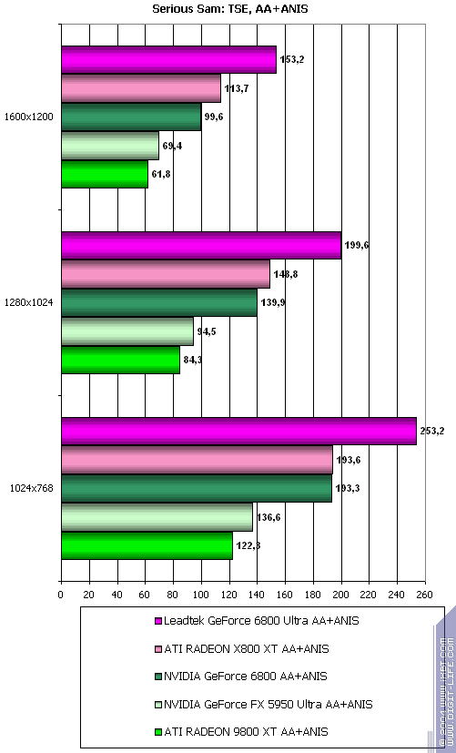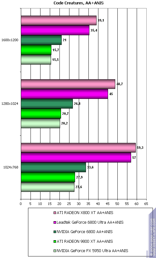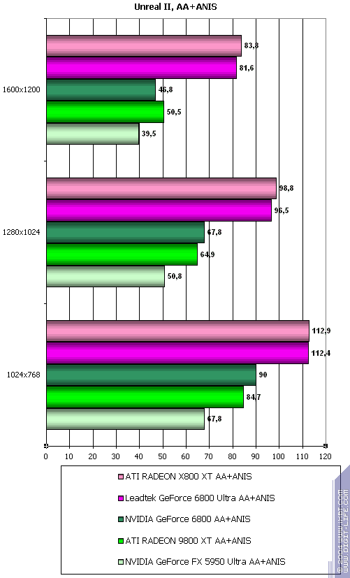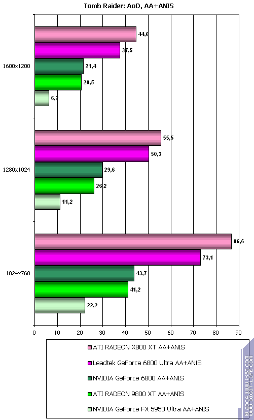 Cамый тяжелый режим с АА и анизотропией: а здесь позиции 6800 ослабли вплоть до примерного равенства с 9800 XT. но все же победа над 5950 Ultra убедительная. У 6800 Ultra примерный паритет с соперником.