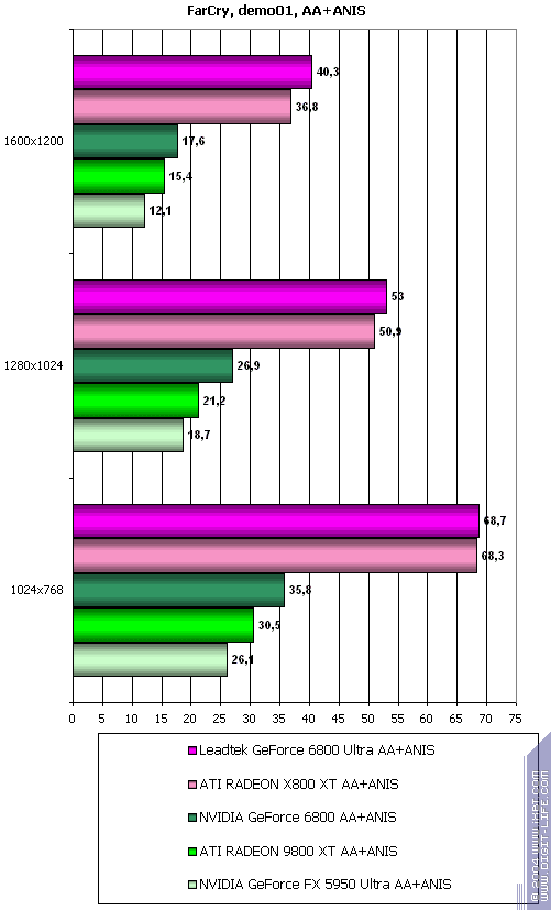 Cамый тяжелый режим с АА и анизотропией: если у 6800 все по-прежнему шоколадно, то у 6800 Ultra радость победы сменилась на горечь поражения.