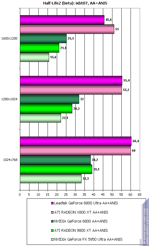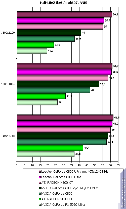 - Half-Life2 (Valve/Sierra) — DirectX 9.0, два разных записанных demo (ixbt07 и coast). Тестирование проводилось при включенной анизотропной фильтрации.