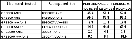 Cамый тяжелый режим с АА и анизотропией: проигрыш у 6800 Ultra, и примерный паритет у 6800 со своими соперникам.