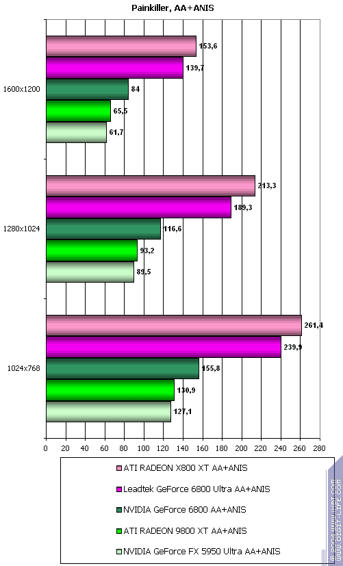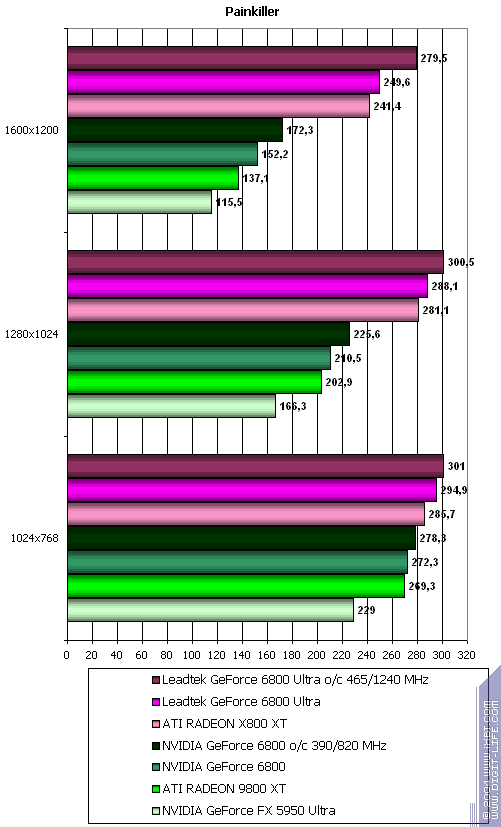 - Painkiller v.1.15 (People Can Fly/Dreamcatcher) — DirectX 9.0, мультитекстурирование, настройки тестирования — все на максимально возможном уровне. Использовался встроенный benchmark.