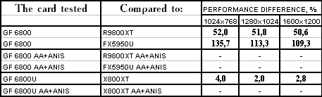 Если с GeForce 6800 Ultra все понятно: ему конкурент только RADEON X800 XT, то GeForce 6800 при его номинальной цене в 299 долларов США (реально от 320 до 400 на конец июня) пока не имеет конкурента от ATI из серии X800. Но, учитывая, что ныне мы видим цены на 9800 XT и 5950 Ultra выше 400 долларов, очень интересно сравнить новинку именно с этими картами. То есть, есть шанс, что вышеперечисленные RADEON 9800 XT и особенно FX 5950 Ultra уже пора или убирать с прилавков, или снижать цены на 30-50%.