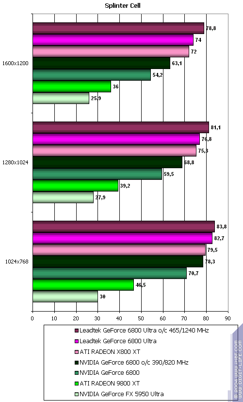 - Leadtek GeForce 6800 против NVIDIA GeForce FX 5950 Ultra — да, работа над ошибками по шейдерам 2.0 сделана настолько успешно, что превосходство доходит до трехкратной величины.