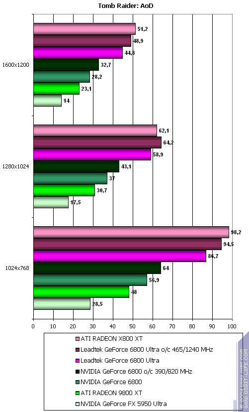 - Tomb Raider: Angel of Darkness v.49 (Core Design/Eldos Software) — DirectX 9.0, Paris5_4 demo, настройки тестирования приведены здесь.
