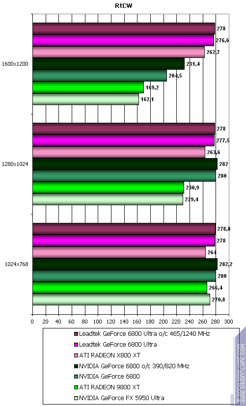 - Return to Castle Wolfenstein (MultiPlayer) (id Software/Activision) — OpenGL, мультитекстурирование, ixbt0703-demo, настройки тестирования — все на максимально возможном уровне, S3TC OFF, конфигурации можно скачать тут