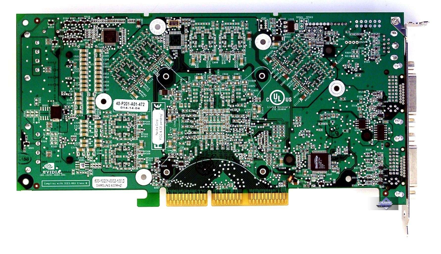 | Карта имеет интерфейс AGP x8/x4, 256 МБ памяти GDDR3 SDRAM, размещенной в 8-ми микросхемах на лицевой стороне PCB. Микросхемы памяти Samsung (GDDR3). Время выборки у микросхем памяти 2.0 ns, что соответствует частоте работы 500 (1000) МГц, на которой память и работает. Частота работы GPU — 350 MHz. Шина обмена с памятью — 256 bit. | ![]() |