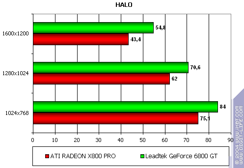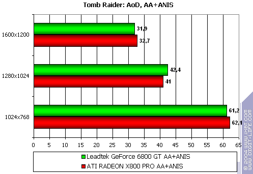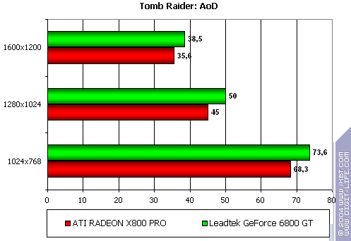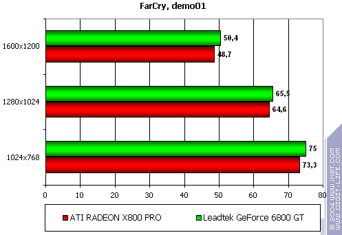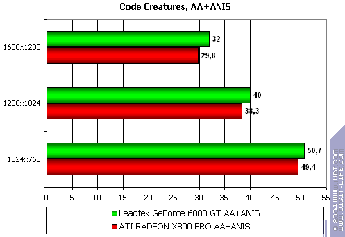 - Leadtek WinFast A400 GT TDH против ATI RADEON X800 PRO — примерное равенство сил соперников, с некоторым перевесом у первого (хотя, опять-таки, вряд ли кто будет играть в подобные игры на мощных ускорителях без АА или анизотропии).