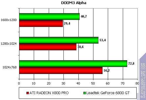 - Leadtek WinFast A400 GT TDH против ATI RADEON X800 PRO — подавляющее превосходство первого над вторым! Конечно, это старая альфа-версия игры, по ней нельзя судить о том, что будет в релизе DOOM III, который появится на прилавках уже в ближайшие дни. Но все же, весьма интересно.