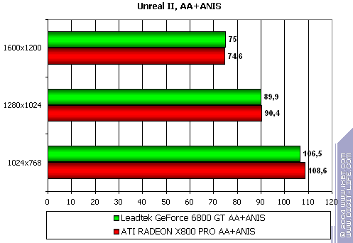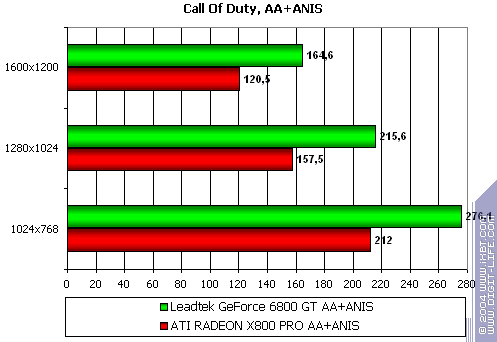 - Leadtek WinFast A400 GT TDH против ATI RADEON X800 PRO примерное равенство сил соперников, с некоторым перевесом у первого (хотя, опять-таки, вряд ли кто будет играть в подобные игры на мощных ускорителях без АА или анизотропии).