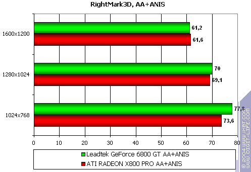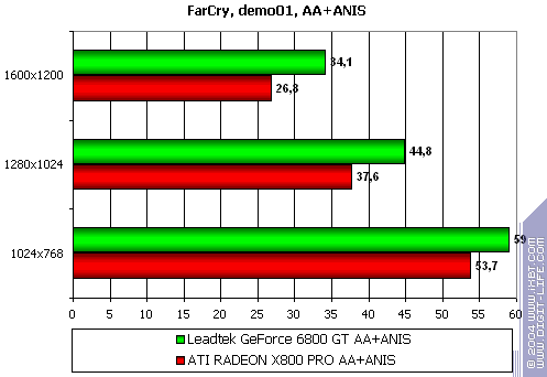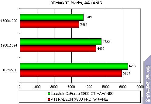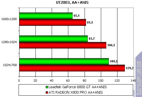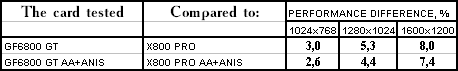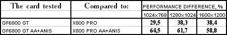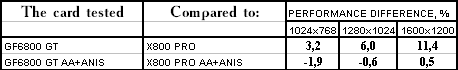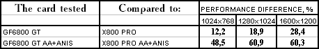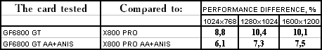 - Leadtek WinFast A400 GT TDH против ATI RADEON X800 PRO все же присудим небольшой перевес у 6800GT, поскольку скорости уже таковы, что использовать вместе АА и анизотропию можно, но осторожно :).