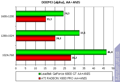 - Leadtek WinFast A400 GT TDH против ATI RADEON X800 PRO подавляющее превосходство первого над вторым! Конечно, это старая альфа-версия игры, по ней нельзя судить о том, что будет в релизе DOOM III, который появится на прилавках уже в ближайшие дни. Но все же, весьма интересно.