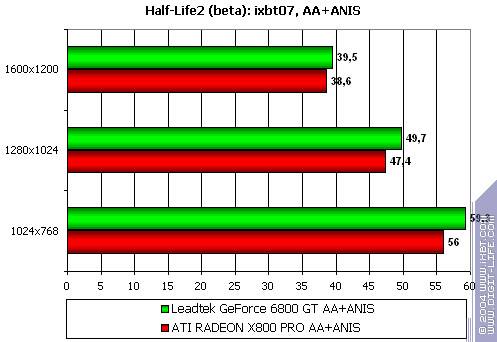 - Half-Life2 (Valve/Sierra) DirectX 9.0, demo (ixbt07. Тестирование проводилось при включенной анизотропной фильтрации, а также в тяжелом режиме с АА и анизотропией.
