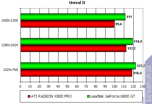 - Leadtek WinFast A400 GT TDH против ATI RADEON X800 PRO уверенное лидерство у первого. Впрочем, мы давно уже наблюдаем явный перевес у всех продуктов NVIDIA в данной игре. Что поделать, OpenGL всегда давался этой компании лучше, и скорости были выше, чем у конкурентов.