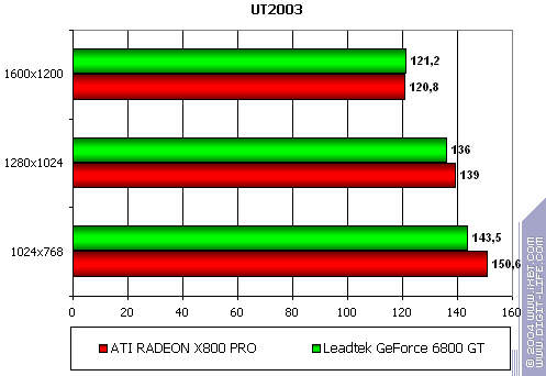 - Leadtek WinFast A400 GT TDH против ATI RADEON X800 PRO все аналогично предыдущему тесту: примерное равенство.