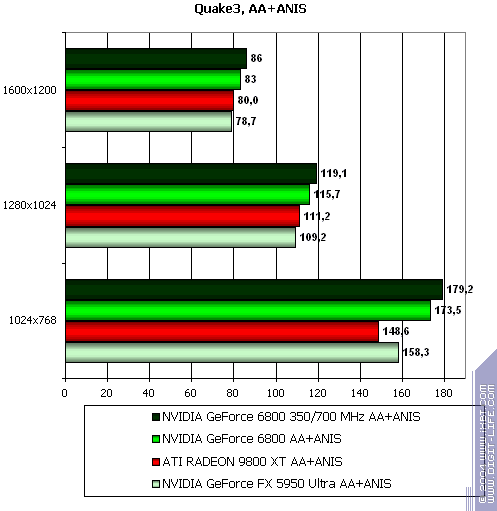 - NVIDIA GeForce 6800 против ATI RADEON 9800 XT от почти паритета без АА+АФ (уперлось все в возможности системы), до 41% прироста скорости у 6800!