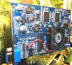 | Карта имеет интерфейс AGP x8/X4, 256 МБ памяти GDDR3 SDRAM, размещенной в 8-ми микросхемах на лицевой стороне PCB. Микросхемы памяти Samsung (GDDR3). Время выборки у микросхем памяти 1,6 ns, что соответствует частоте работы 625 (1250) МГц, память же работает на частоте 550 (1100) МГц. Частота работы GPU 425 MHz. Шина обмена с памятью — 256 bit. Число пиксельных конвейеров × число текстурных блоков — 16х1. Число вершинных конвейеров — 6. Обращаю внимание на повышенную частоту работы ядра (425 МГц) против номинала в 400 МГц. И стоит также обратить внимание на то, что частоты разделяются на 2D/3D, поэтому если кто увидит в 2D-режиме частоту чипа 400 МГц, пусть сразу не паникует и проверит частоты работы карты в 3D. | ![]() |
