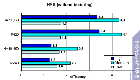 Картина практически идентична, небольшие отличия в эффективности 450 МГц варианта NV40 вызваны иным соотношением частот ядра и памяти.