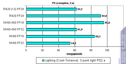 Мы видим, что NV40 на частоте 450 МГц работает быстрее. Но, недостаточно быстрее — лидер по пиксельным шейдерам игровой сложности прежний — R420.