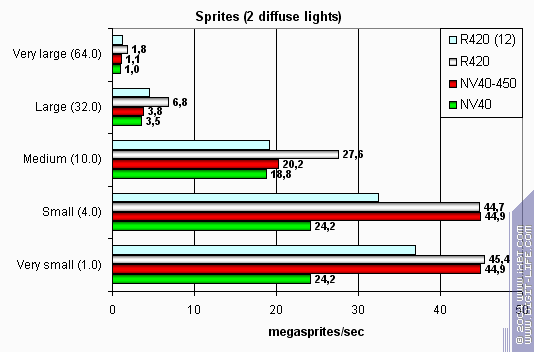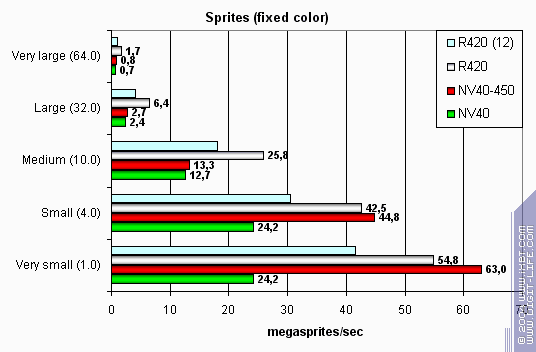 Интересно, что в новых драйверах NVIDIA кардинально исправлено досадное падение производительности, которое мы наблюдали на малых размерах спрайтов!