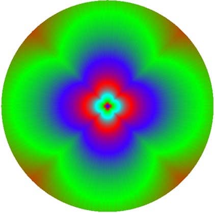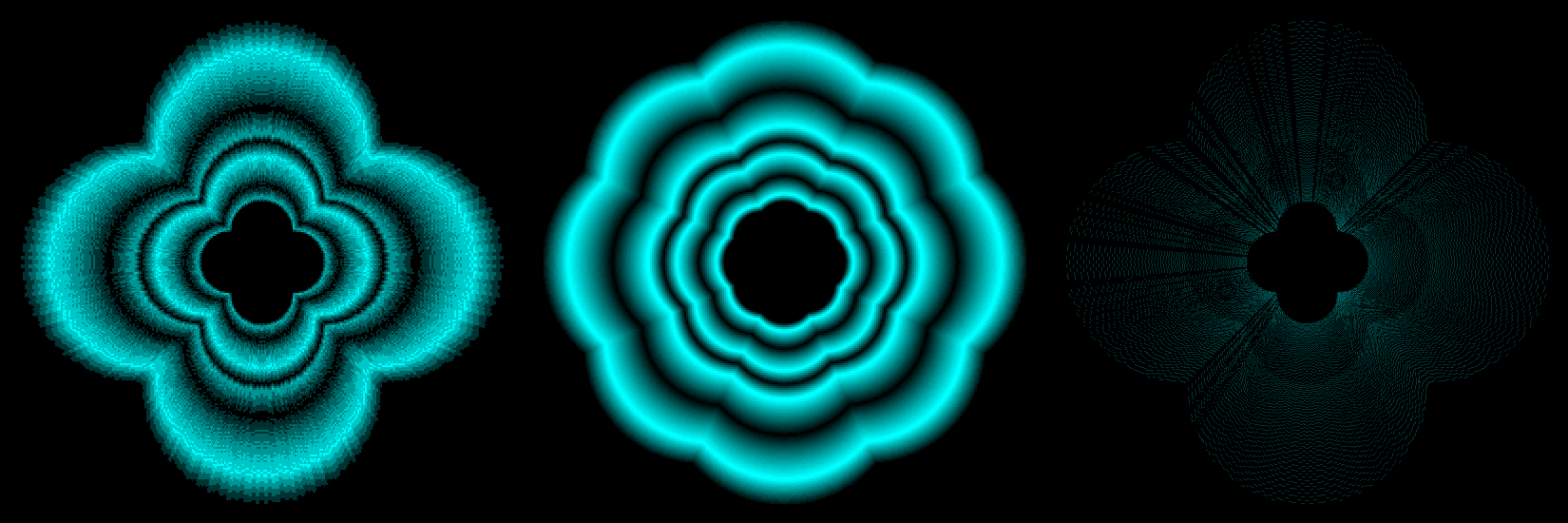 Форма лепестков, изображенных на картинке выше, зависит от метода, по которому рассчитывается Scale factor — Rho (см. формулу 1). В случае трилинейной фильтрации, цвета на картинке должны плавно переходить один в другой.