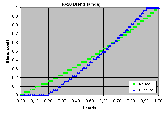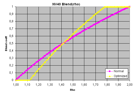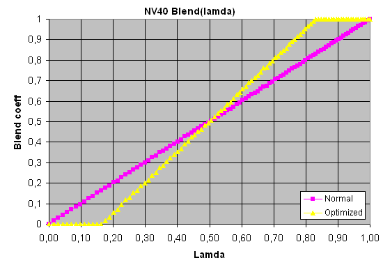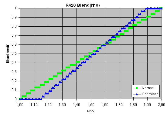 Посмотрим, что происходит на самом деле. Ниже приведены четыре графика построенные по экспериментальным данным по два на каждый из чипов R420 и NV40. Один из графиков показывает зависимость применяемого коэффициента трилинейной интерполяции от Rho, а другой от Lamda (смотри формулы и описание в начале статьи). На каждом из графиков присутствуют две кривые для стандартной трилинейной фильтрации и для оптимизированной.