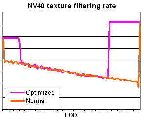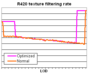 И напоследок — сладенькое: графики изменения скорости выполнения трилинейной фильтрации в зависимости от уровня детализации текстур (LOD). Естественно для оптимизированных и стандартных режимов фильтрации. Предупреждение: масштабы по оси Y для разных чипов разные.