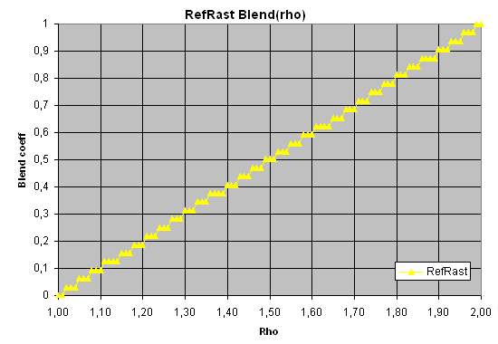 Теперь вернемся назад к рассмотрению графиков, полученных на R420 и RefRast. Мы можем отметить два момента: ступенчатое поведение графика и линейную зависимость коэффициента интерполяции от Rho, a не от Lamda как рекомендует спецификация OpenGL (и DirectX — см. ниже).