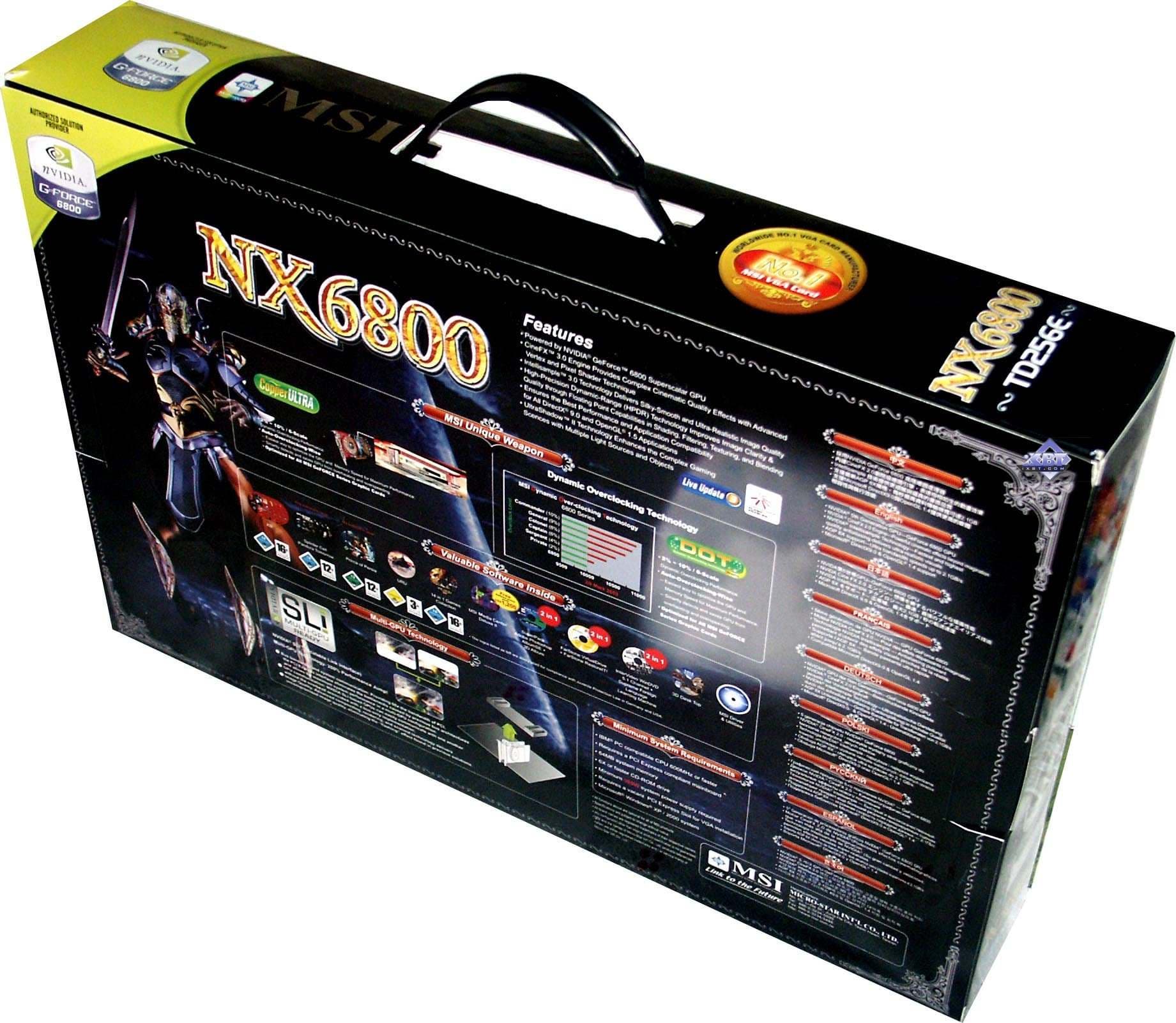 - MSI GeForce 6800 PCI-E (NX6800) 256MB — продукт очень интересный, если цена на него будет реально близкой к 300 долларам, но никак не к 400, как сейчас, ибо при таком раскладе карта проигрывает всем и вся, особенно это касается соперничества с X800XL, ведь ныне цены на него также пока сильно завышены торговцами, и могут иметь стремление к падению. Состязание с 6600GT SLI — весьма условное, поскольку хоть тандем и выигрывает почти везде у 6800, но надо учитывать, что пока еще SLI очень сырая технология, драйверы все же дают много артефактов, особенно в тяжелых режимах, а также в ряде игр SLI просто не работает (это касается новинок, например, Chronicles of Riddick).