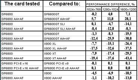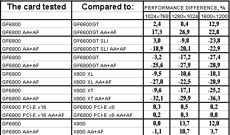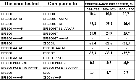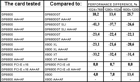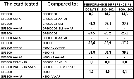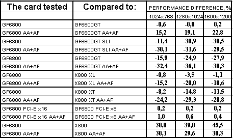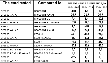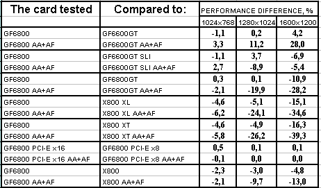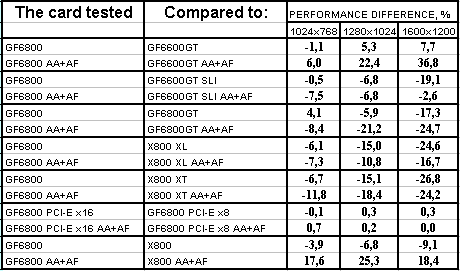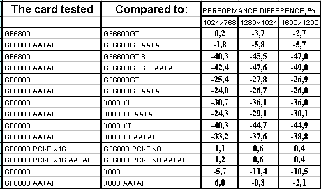 Ситуация в целом почти такая же, но лишь проценты отставания от X800XL уменьшились, а с X800 вообще образовался паритет. Тандем 6600GT SLI все еще выигрывает с АА+АФ, хотя без этой нагрузки 6800 смог догнать эти две карты и даже в 1024х768 обогнать. Но кто же будет игнорировать АА+АФ, если платит такие деньги за 3D-ускоритель?