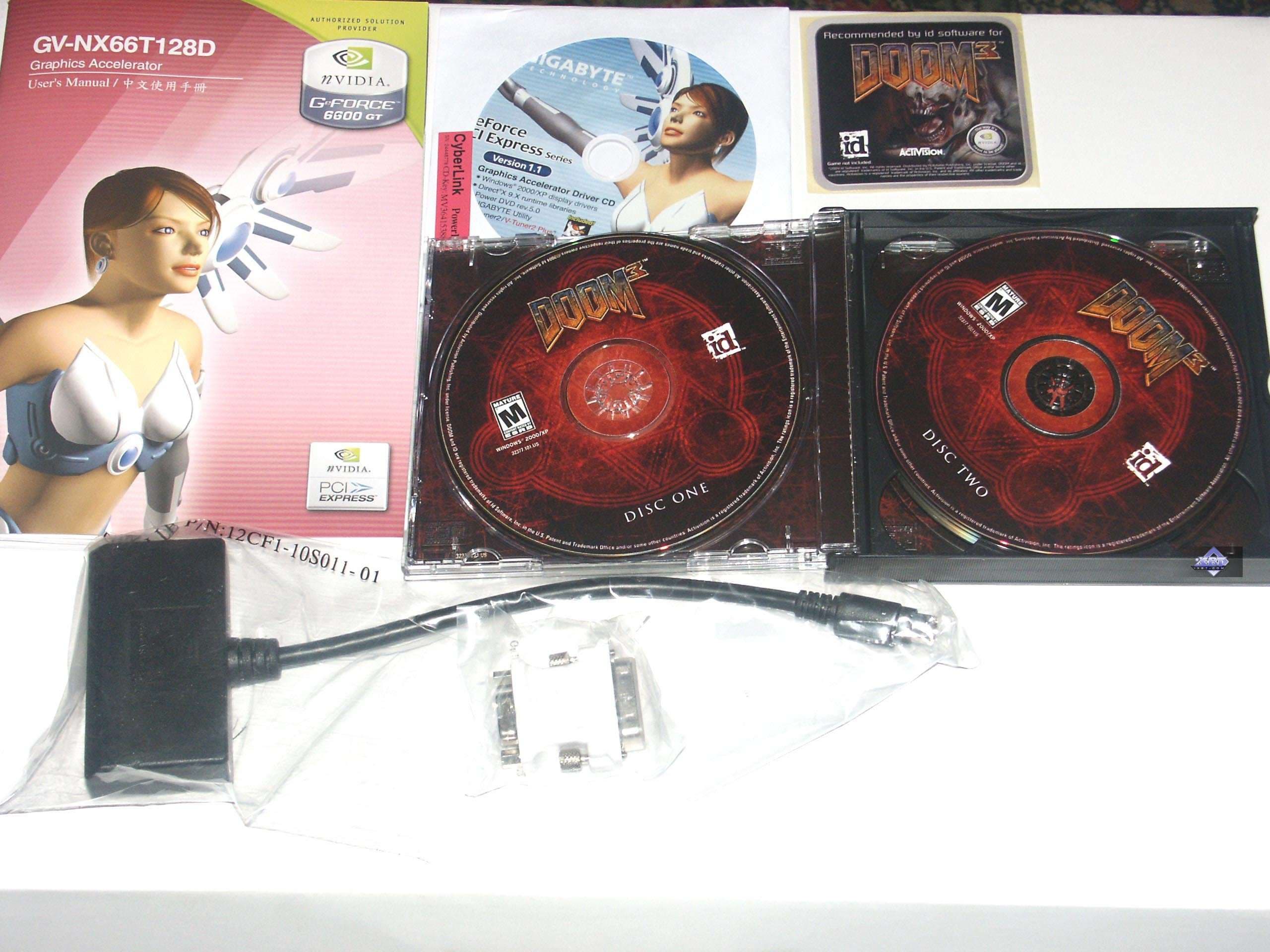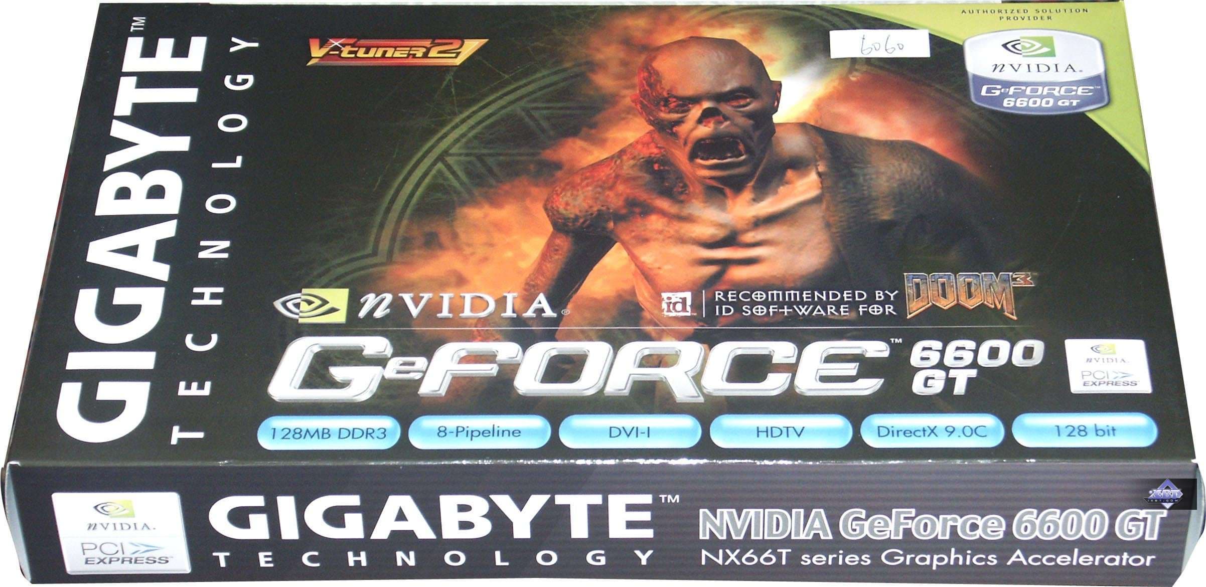 - Gigabyte GeForce 6600GT 128MB — сам ускоритель ничем особенным не выделяется, полная копия эталонного дизайна, но вот то, что в комплект поставки уже включен DOOM III, это очень приятно! И не надо забывать про фирменную утилиту оверклокинга VTuner и про потенциал SLI. Качество 2D в 1600х1200 при 85 Гц — хорошо.