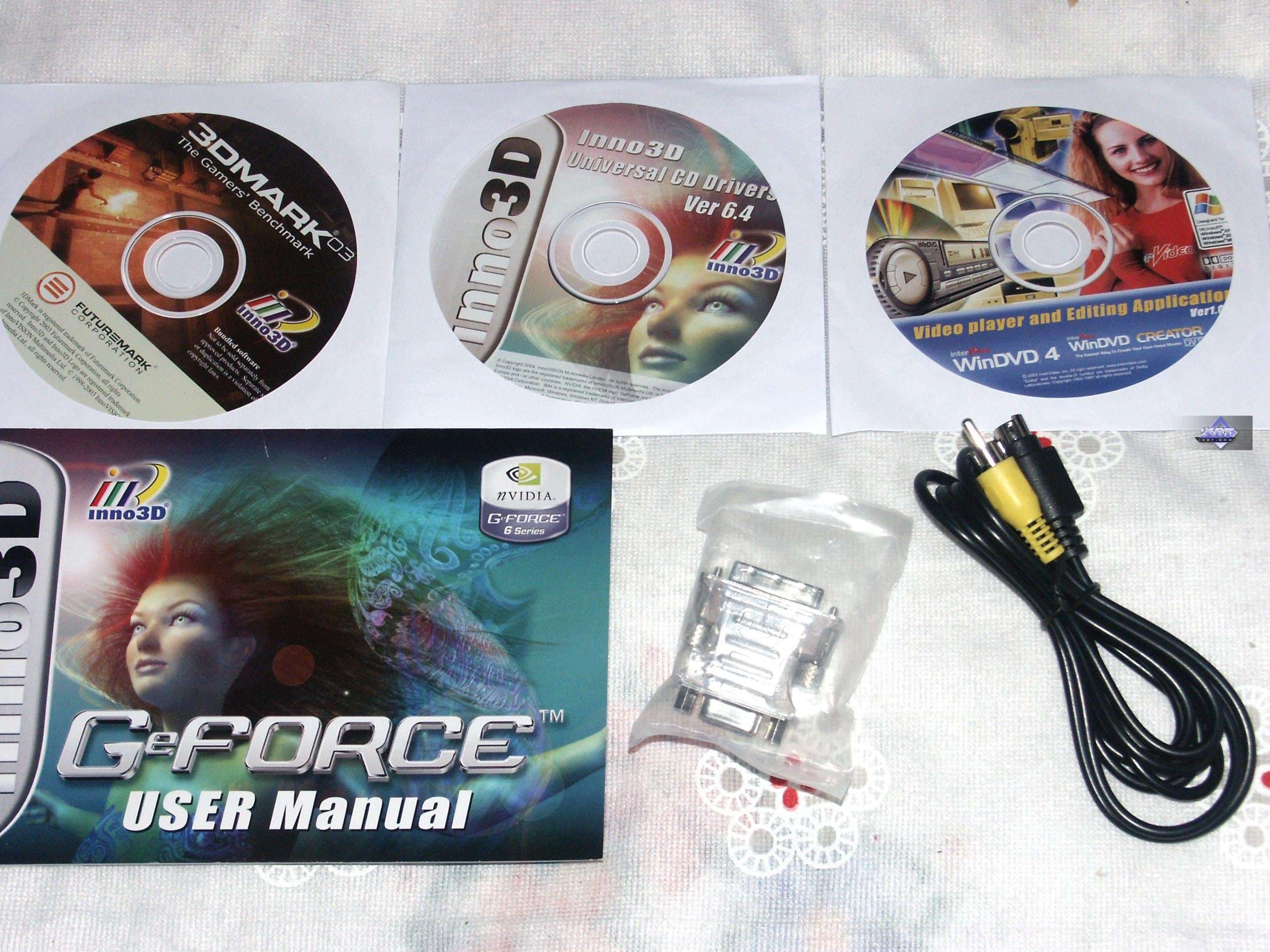 - Inno3D GeForce 6600GT 128MB — имеет память 1.6нс, хороша для оверклокеров, однако частоты не подняты, поэтому это уже забота только именно «разгонщиков». Комплект поставки весьма скромный, да и 3DMark03 уже устарел. SLI точно также поддерживается. Качество 2D в 1600х1200 при 85 Гц — хорошо.