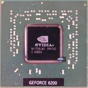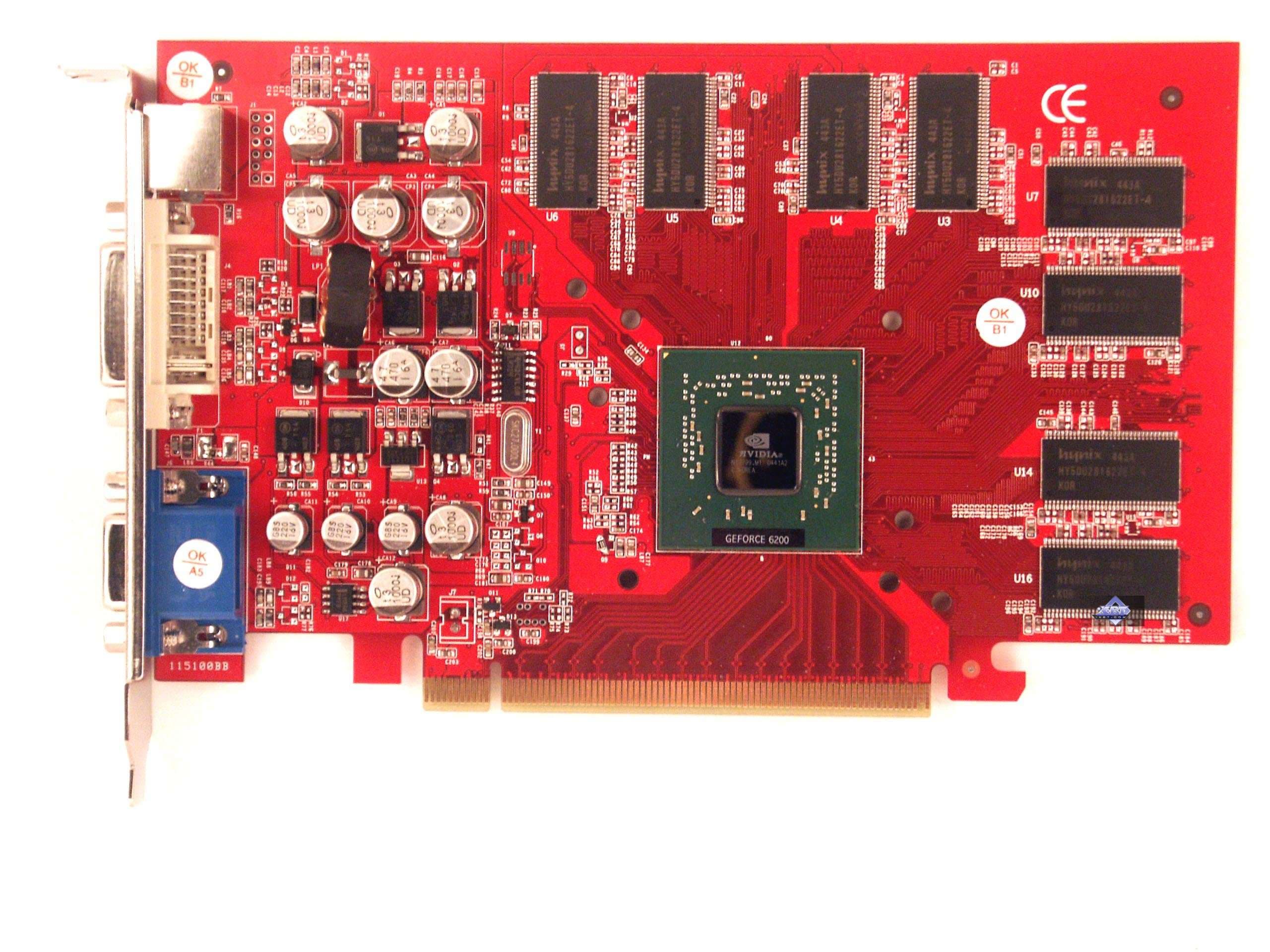 Среди рассматриваемых сегодня карт есть и плата на базе GeForce 6200. Это по сути первый наш материал по такому чипсету. Как можно будет увидеть, сам процессор представляет собой отбраковку от NV43 (GeForce 6600), и потому даже карта от своего аналога на базе 6600 не отличается. Напомню, что GeForce 6600 несет в себе 8 пиксельных конвейеров и 3 вершинных. Соответственно, 6200 — 4 пиксельных, и 3 вершинных.