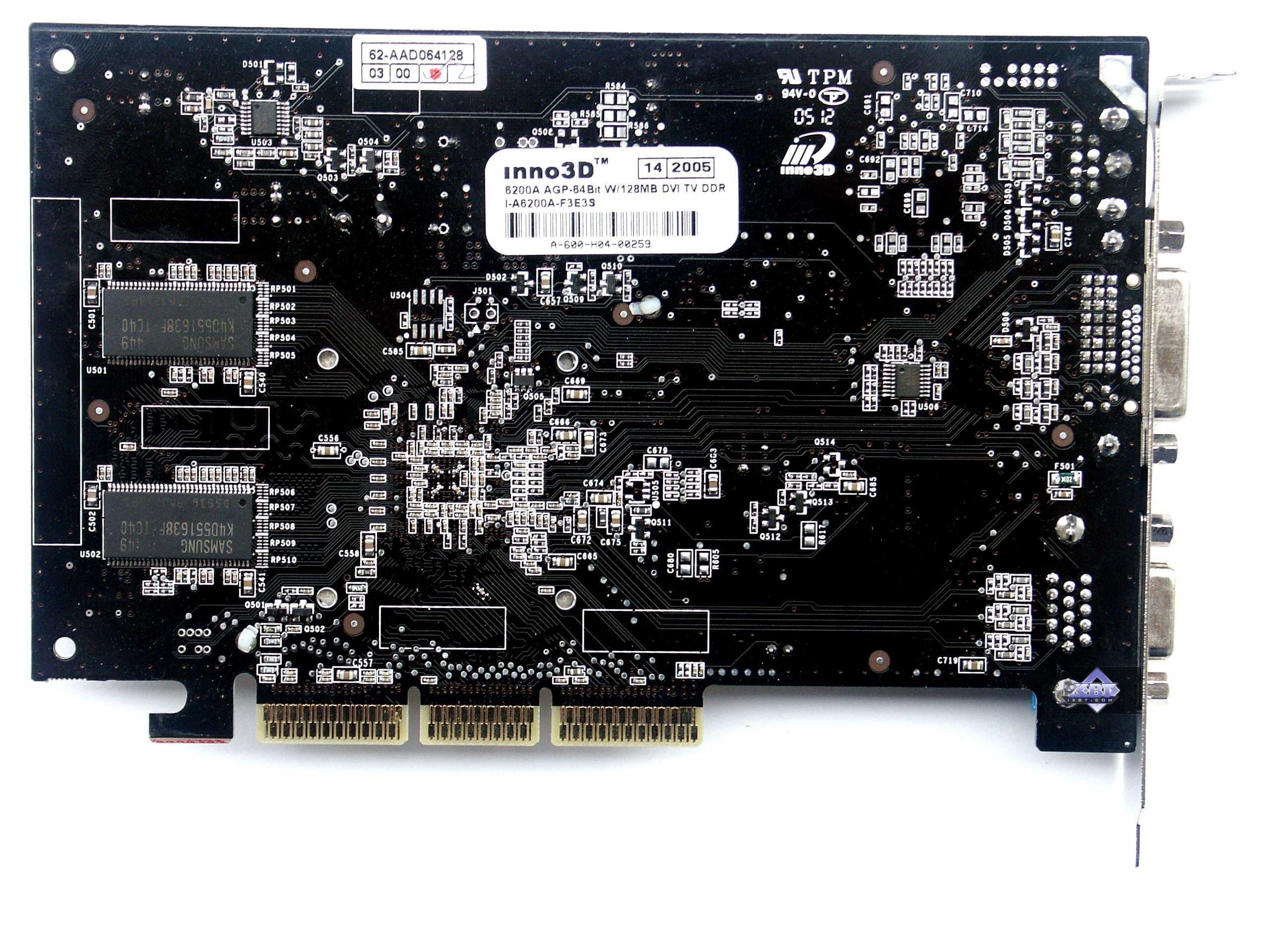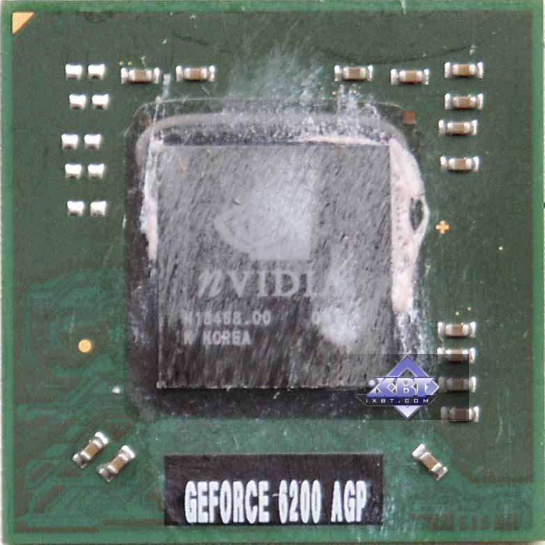 Маркировка чипа недвусмысленно говорит, что это 6200 AGP. Еще раз напоминаю, что все 6200 AGP — с 64-битной шиной, поскольку все 6200 со 128-битной шиной и для AGP-сегмента, имеют встроенный PCI-E интерфейс, и карты снабжаются мостами HSI.