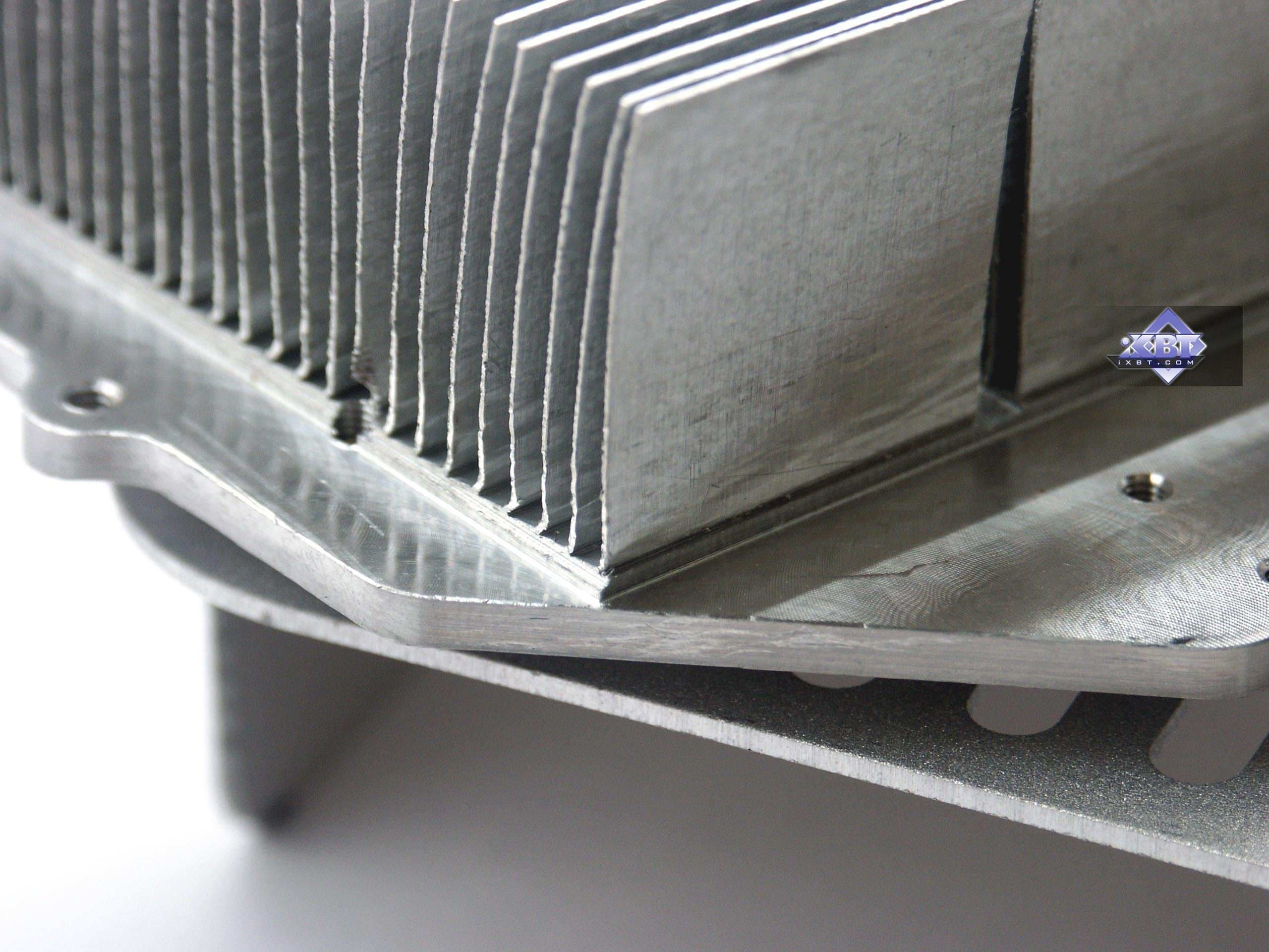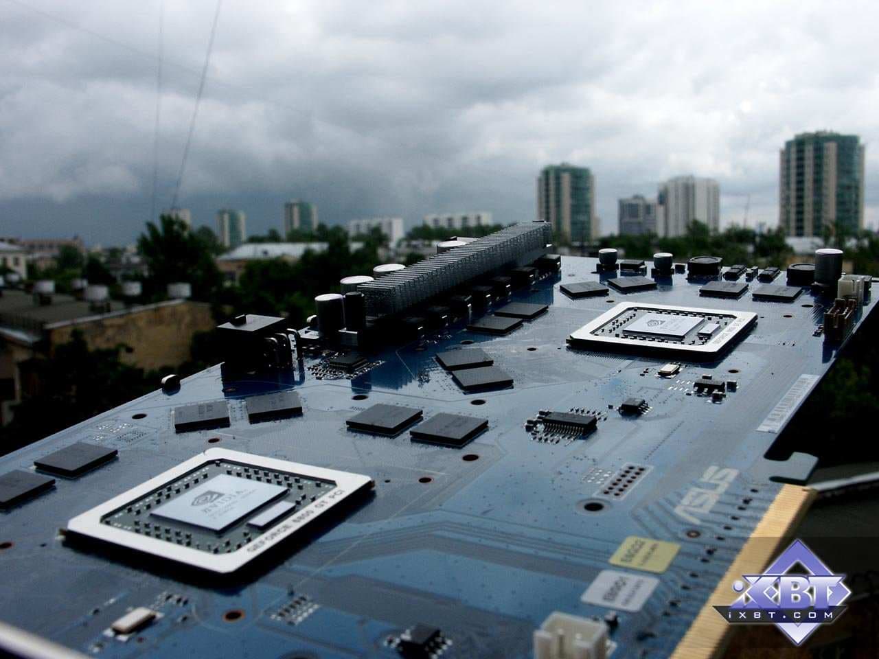 Не правда ли, просто монстр? :) Конструкция PCB такова, что на ней последовательно расположено два GPU-блока: чип плюс окружающие его микросхемы памяти. Поскольку и так длина карты стала запредельной, то для размещения силового блока потребовалось один GPU-блок сместить по вертикали, и поэтому они оказались расположены уже не по горизонтали, а по диагонали. Это привело к увеличению высоты карты в целом. Вот так те же две платы выглядят на стенде: