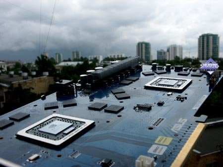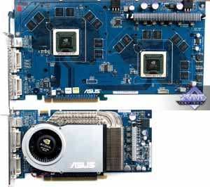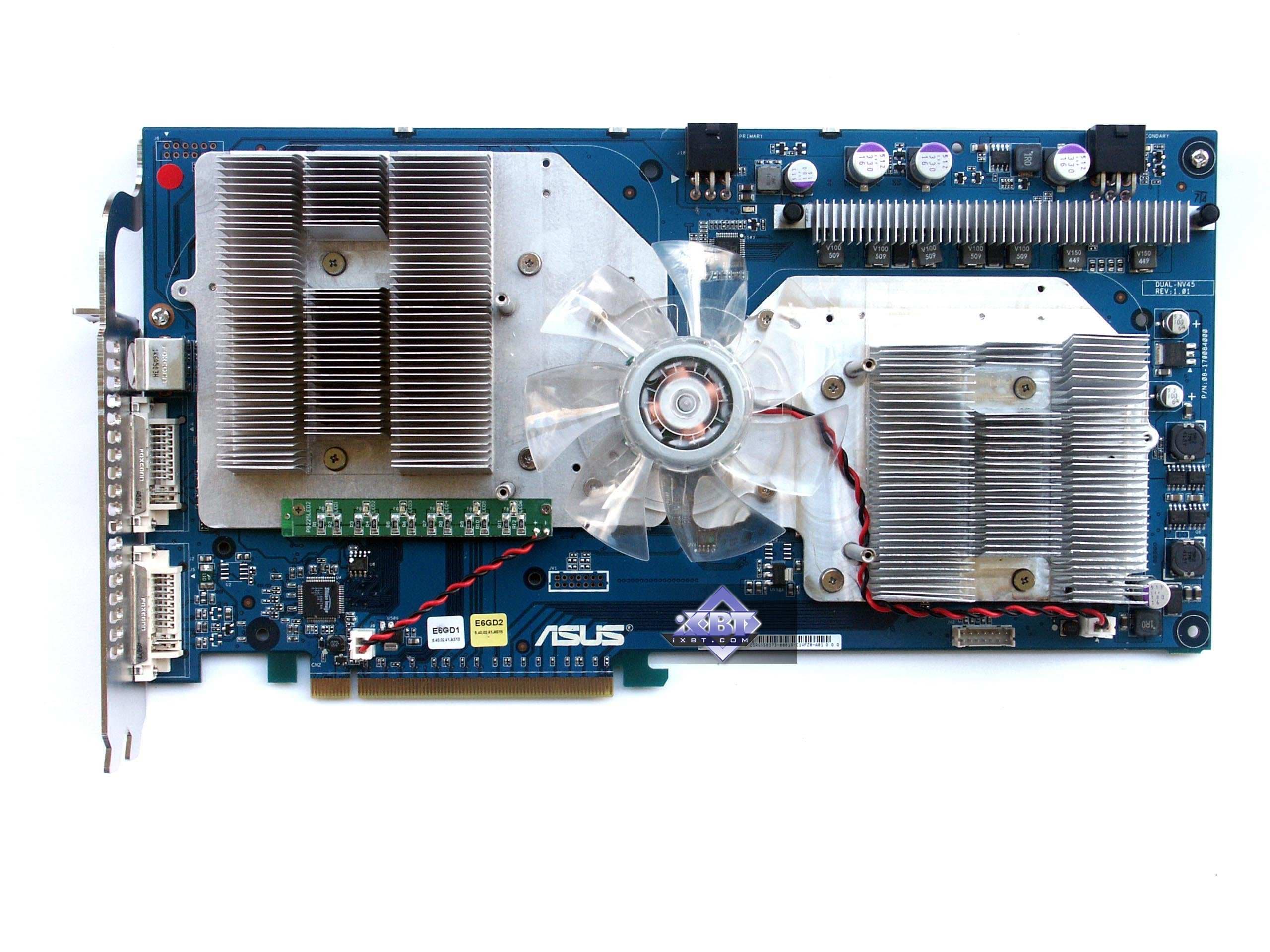 На вышеупомянутой выставке ASUS показал уникальную вещь, объединив две сами по себе сложнейшие видеокарты на одной PCB. Если взглянуть на фотографии такой платы (ниже), то сразу привлекают взгляд и размеры, и сложность разводки. В то время демонстрировался, по сути, муляж, неработающий сэмпл. К выставке Computex'2005, прошедшей в конце мая — начале июня на Тайване, ASUS уже основательно подготовился, и нам демонстрировалась уже работающая видеокарта. Об этом написал Александр Воробьев в своем репортаже с выставки.